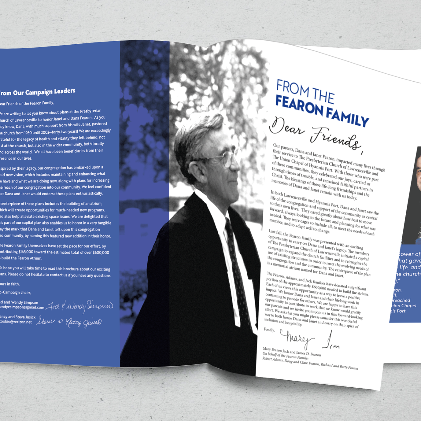 Art Direction, design, print production of a multi-page brochure for a capital campaign of Presbyterian Church of Lawrenceville in Lawrenceville, NJ.
