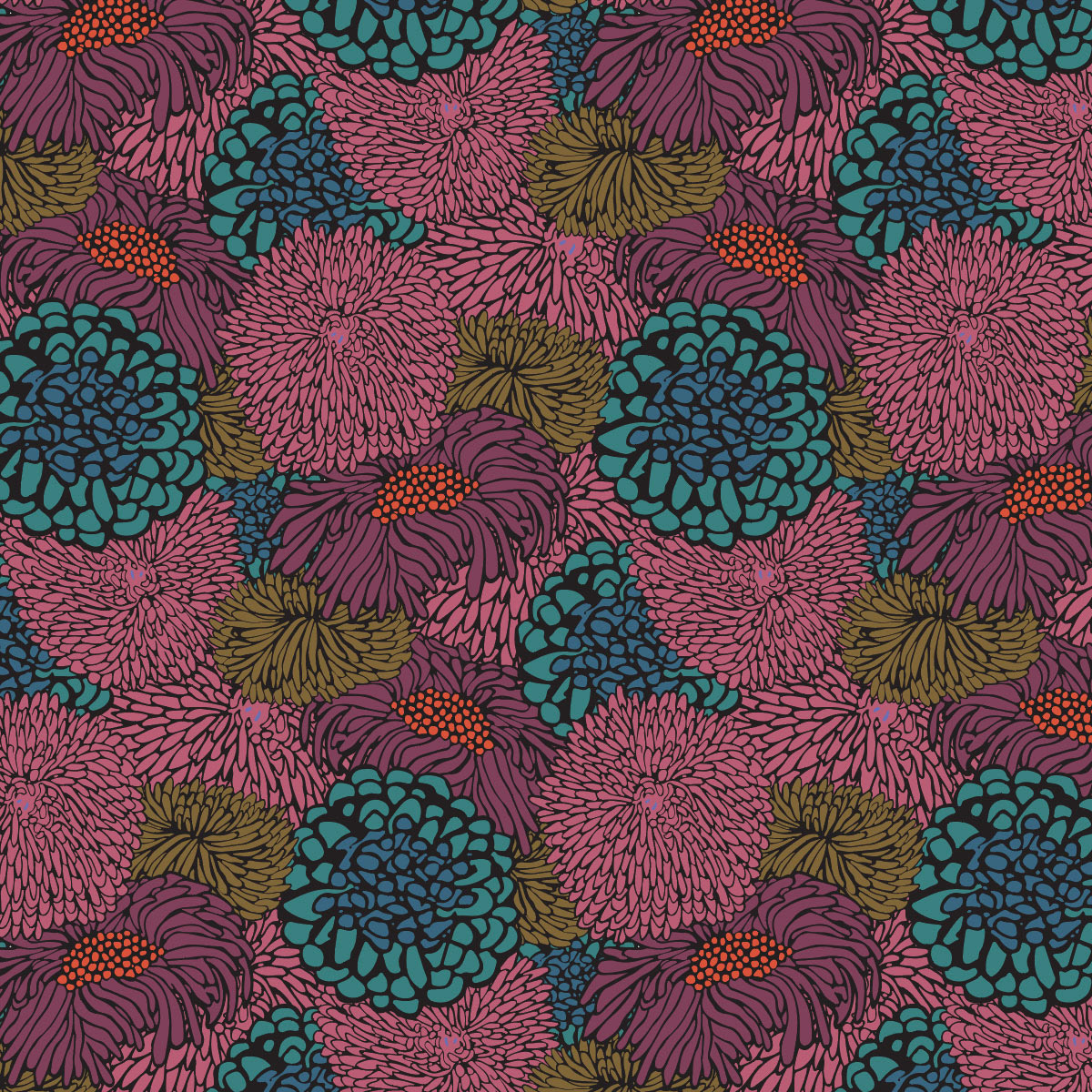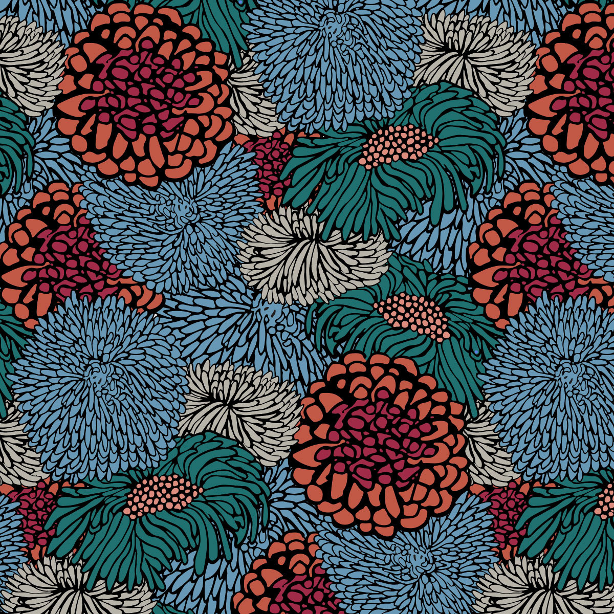 Featuring intricate multi-colored blooms of Chrysanthemums and small simple leaf patterns.