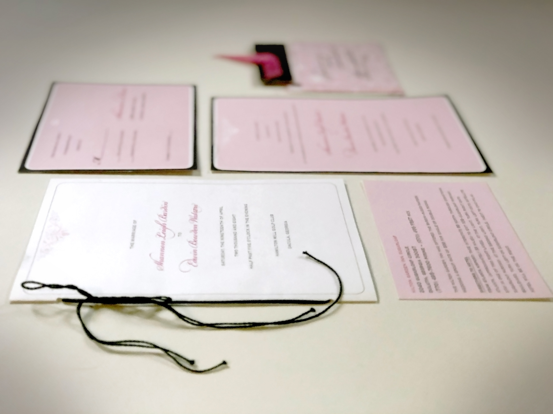 I was asked to put together a beautiful wedding collection for my brother and his bride. I designed, printed and assembled, in-house, a wedding stationery package including invitation, rsvp postcard, reception card, envelope and program. Also, I came up with a special favor booklet (as a surprise!) to give at the rehearsal dinner featuring pictures of the bride and groom through their childhood along with sweet quotes about love.